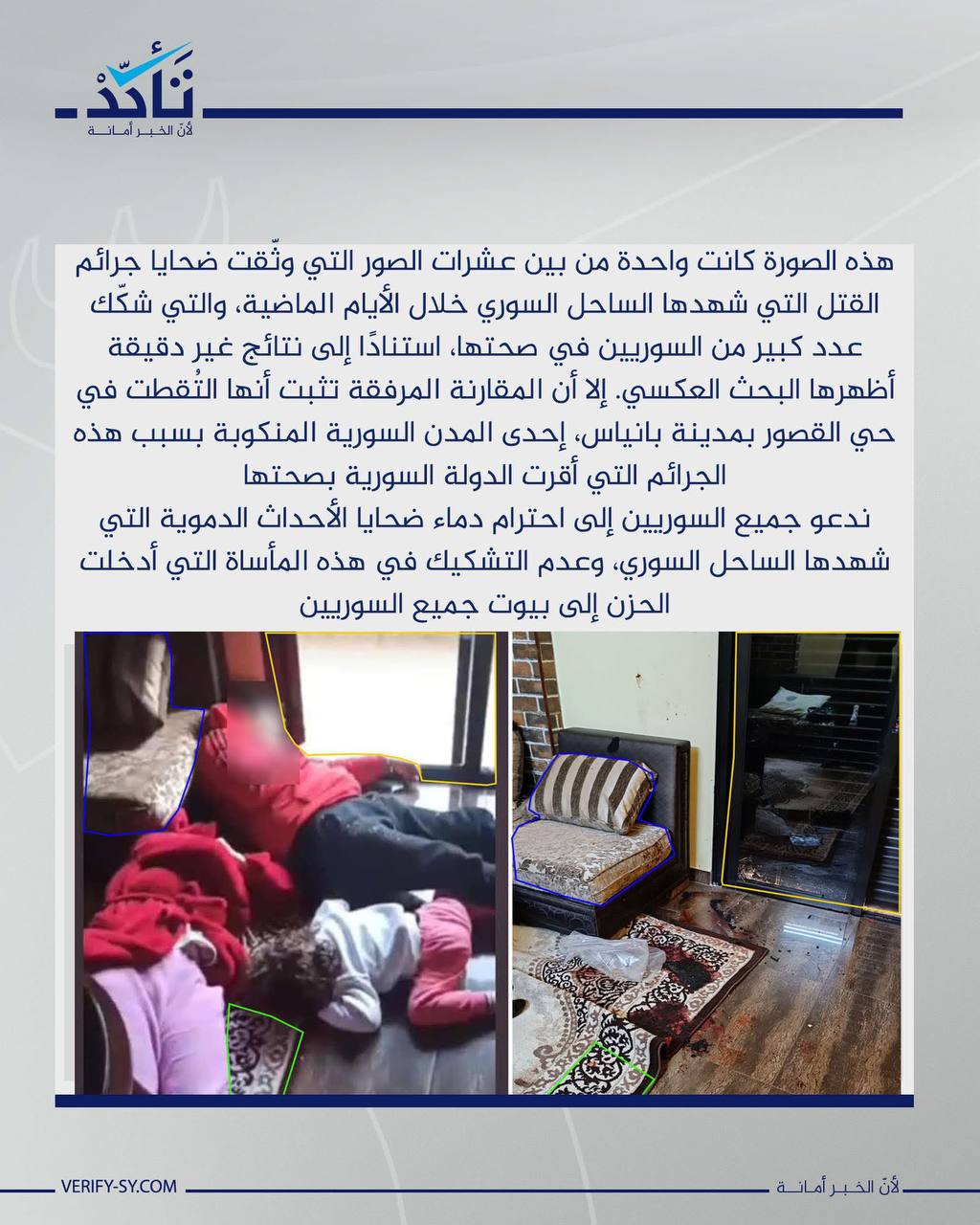ما يحدث ليس خطأً عابرًا ولا التباسًا حسن النية؛ فهذه الصورة بالذات وُظِّفت في حملة تضليل ممنهجة العام الماضي. وقد أكدت منابر التحقق المتعددة، من بينها منصة "تأكد"، أن الصورة أصيلة وتُجسّد واقعة مأساوية لعائلة علوية من مجازر بانياس. ومع ذلك، تتواصل حملة الإنكار دون توقف، بل تذهب إلى حدّ المبالغة في تصوير قتل عناصر الأمن في السادس من مارس، وكأن ذلك يُسوّغ بأثر رجعي ذبح آلاف المدنيين الأبرياء من أبناء الطائفة العلوية.